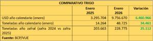 Las exportaciones del cereal de la campaña 2025 alcanzaron 228.775 toneladas entre octubre de 2025 y enero de 2025, lo que representa un incremento de 25.112 toneladas respecto al mismo periodo de la zafra 2024, cuando se habían embarcado 203.663 toneladas.