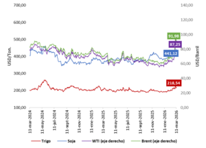 Precios internacionales de granos y petróleo. Fuente: CBOT e Investing