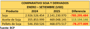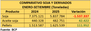 Así, el complejo soja permitió un ingreso de divisas de USD 3078 millones frente a los USD 3828 millones registrados a setiembre de 2024, lo que refleja la caída en los precios internacionales del grano.