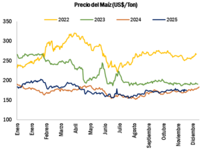 En cuanto al maíz, el precio promedio de enero a noviembre se ubicó en 176,36 USD/ton, un nivel superior a los 171,39 USD/ton registrados en el mi smo periodo de 2024. A inicios de diciembre, la cotización alcanzó 175,09 USD/ton. A pesar de este incremento, la abundante oferta global y los altos niveles de inventarios continúan limitando la posibilidad de subas más significativas.