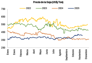 Durante la primera semana de diciembre, la soja registró 406,12 USD/ton, un aumento interanual de 11,2%. No obstante, el promedio de enero a noviembre se redujo 6,5% frente al mismo periodo de 2024. En el último trimestre, el mercado mostró una recuperación más firme, impulsada por expectativas de una mayor demanda externa. Entre los factores que aportaron dinamismo se destaca el retorno de algunas compras de soja estadounidense por parte de China, aunque los volúmenes siguen siendo acotados.
